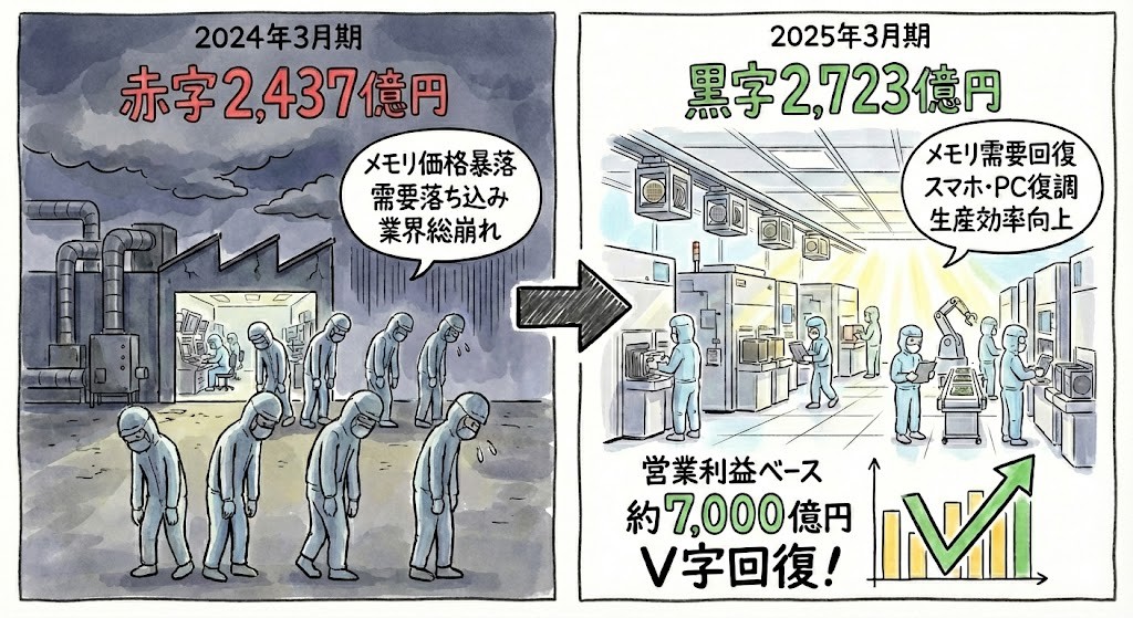 (原因はメモリ価格の暴落。スマホ・PC需要が落ち込んで、業界全体が総崩れやった)