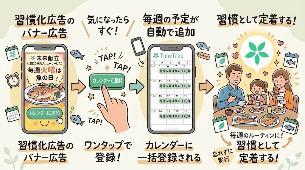 でもTimeTreeの広告は、ユーザーが自分のカレンダーに予定として追加する。