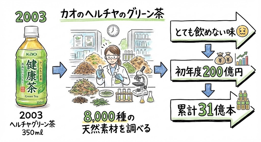 - ヘルシア累計31億本。でもお〜いお茶 濃い茶は100億本売れた